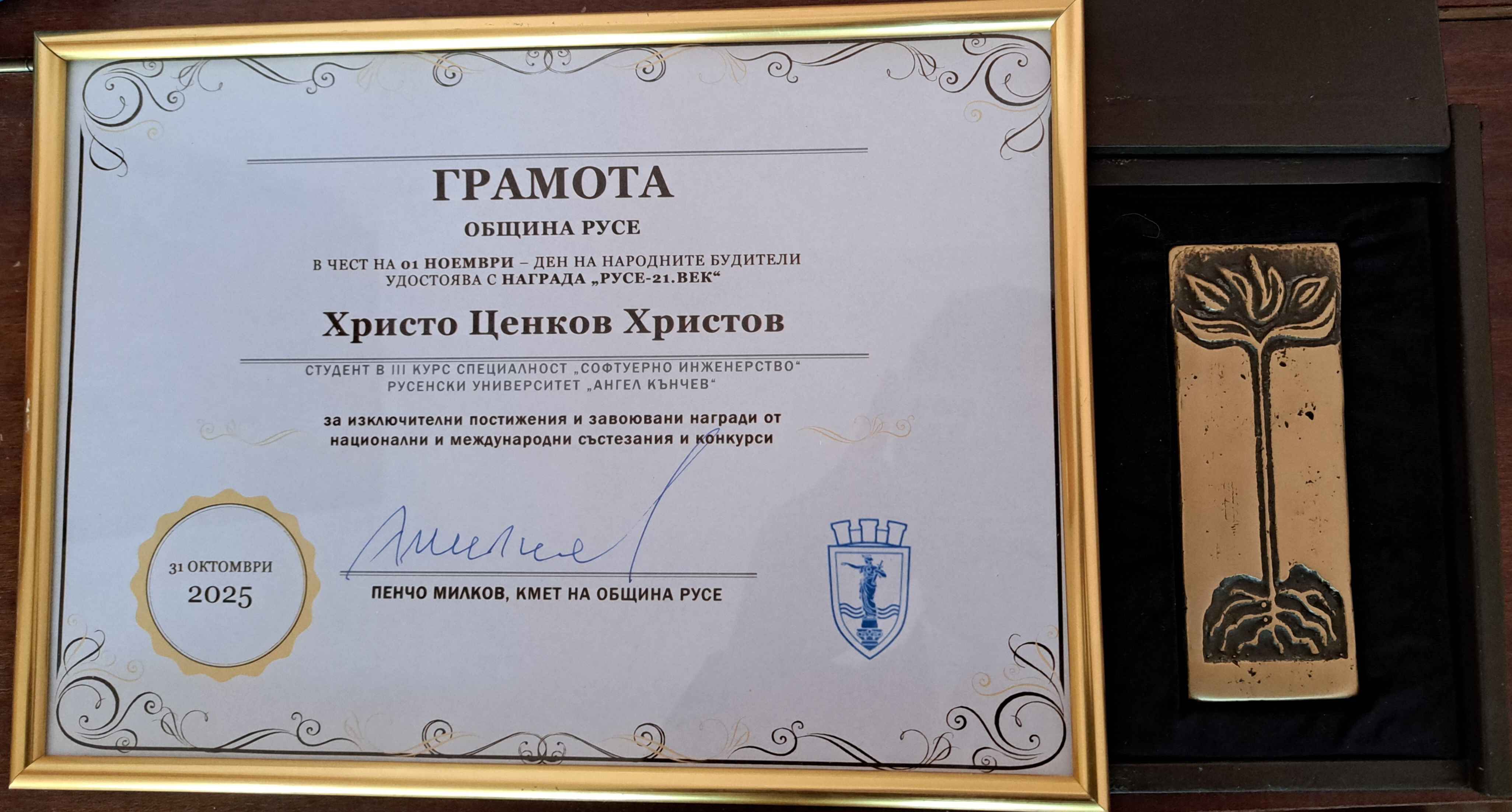 🎓✨В навечерието на 1 ноември – Деня на народните будители, Община Русе отличи изявени ученици и студенти с престижната награда „РУСЕ – 21.ВЕК“. Сред наградените е и Христо Ценков Христов – студент трети курс в специалност „Софтуерно инженерство“ при Русенски университет „Ангел Кънчев“.