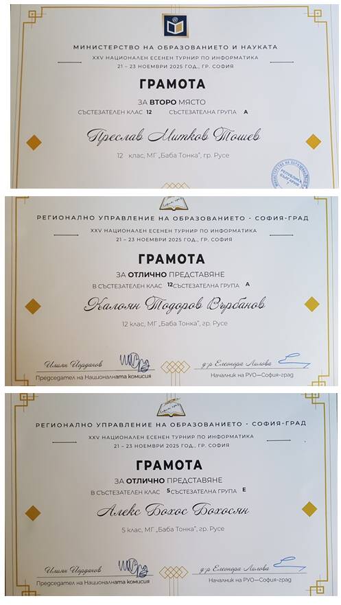 От 21 до 23 ноември 2025 г. в гр. София се проведе Националният есенен турнир по информатика, в който русенските ученици показаха задълбочени знания, логическо мислене и отлични умения в решаването на алгоритмични задачи.