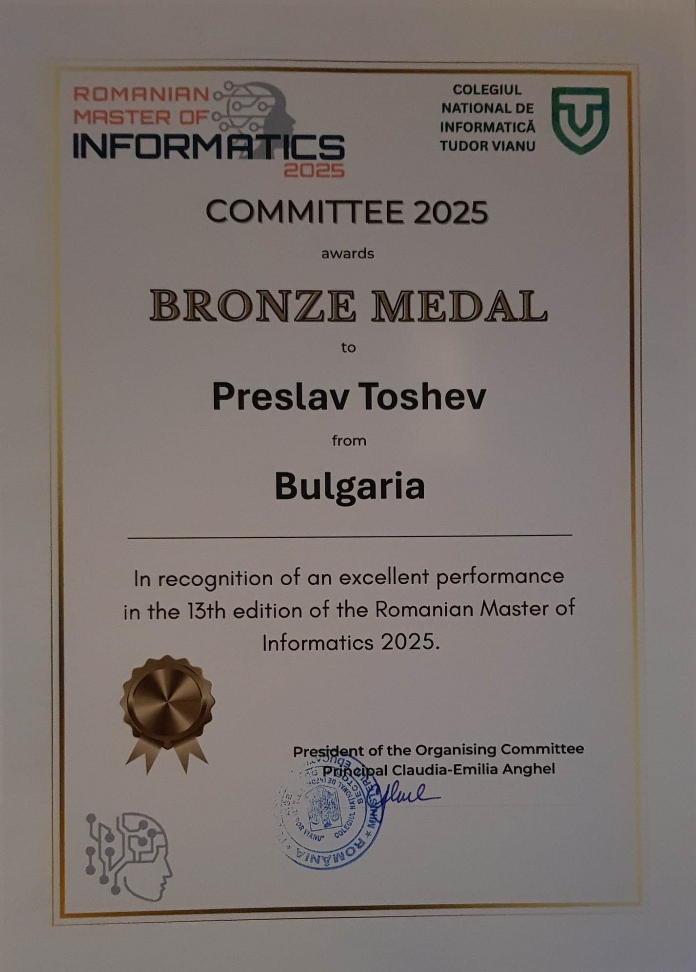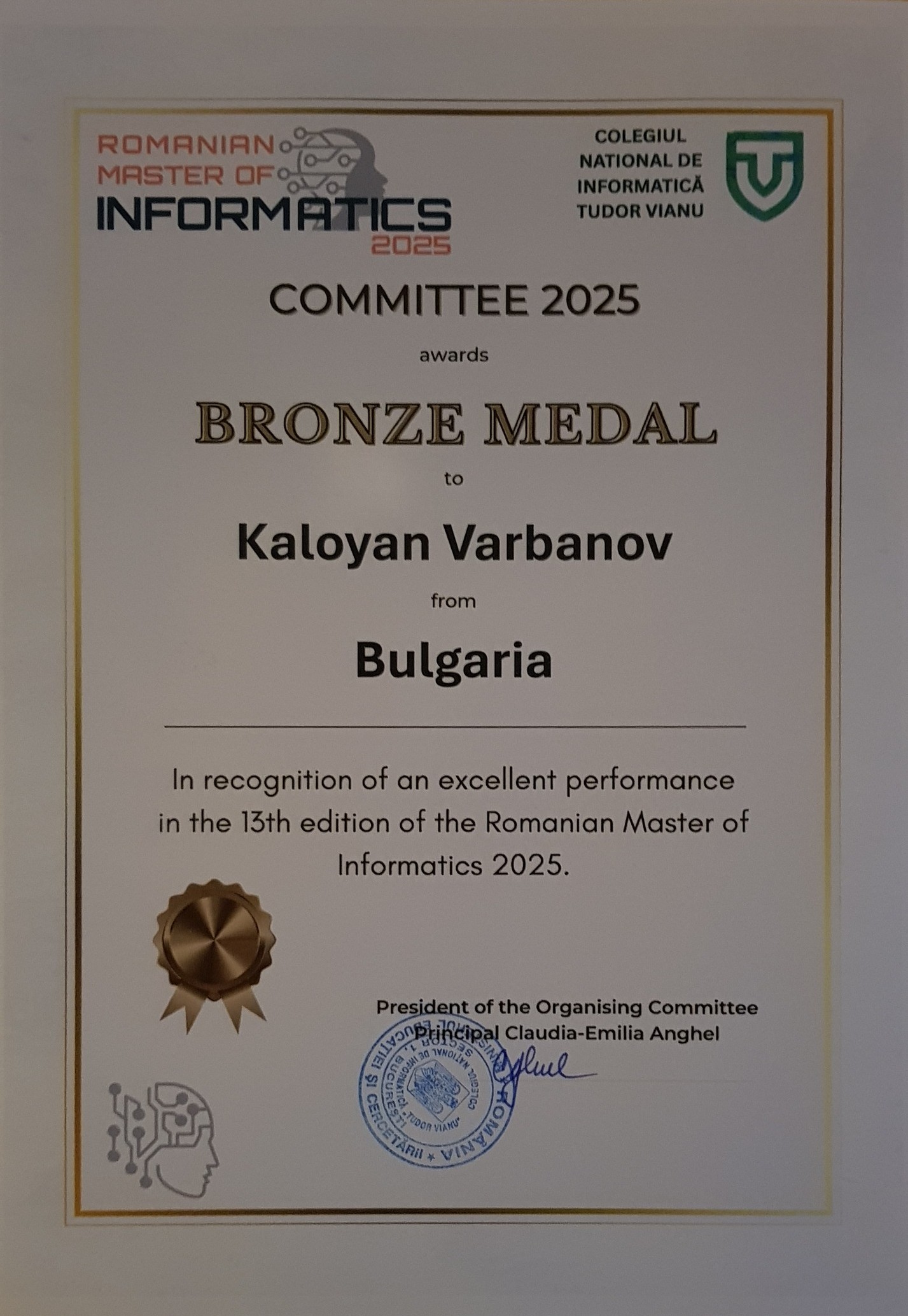 От 26 до 29 ноември 2025 г. в гр. Букурещ се проведе 13-тото издание на престижното международно състезание Romanian Master of Informatics. В надпреварата взеха участие 245 ученици от 14 държави, показвайки изключителни умения в областта на алгоритмите и състезателното програмиране.