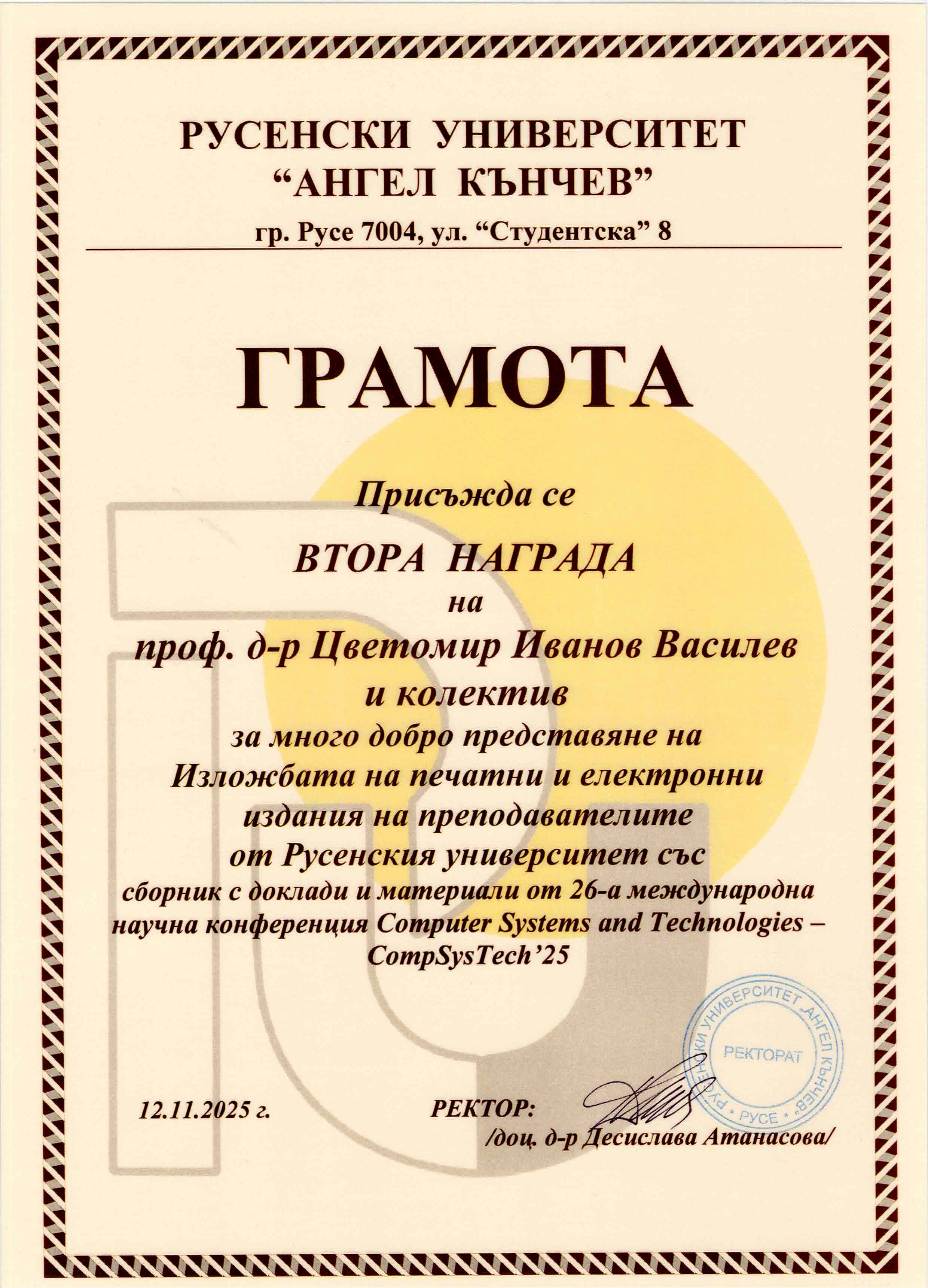 Отличието е присъдено за представянето на сборника с доклади и материали от 26-та международна научна конференция Computer Systems and Technologies – CompSysTech’25, който отразява високото ниво на научна и организационна дейност на екипа.