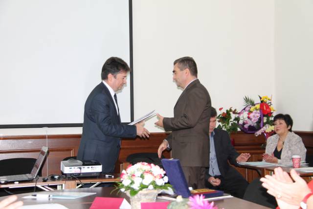 Изпратеният от проф. д-р н. Дянко Минчев, ръководител на катедра „Икономика“ поздравителен адрес бе връчен от доц. д-р Драгомир Илиев на доц. д-р Георги Маринов, ръководител на катедра „Международни икономически отношения” при Икономически университет – Варна.